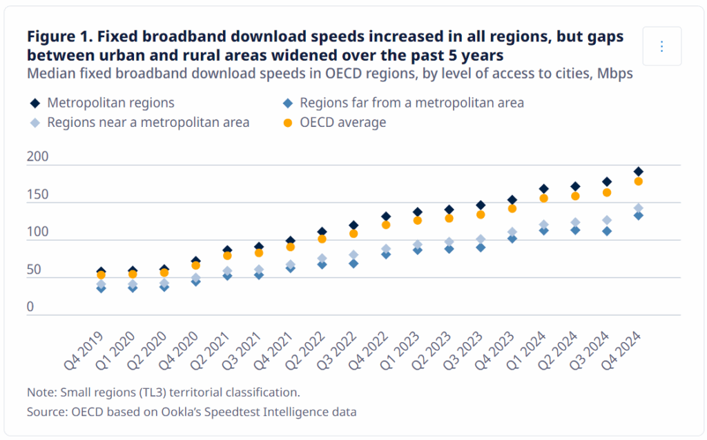 OECD의 새로운 보고서에 따르면, OECD 국가 전역에서 고속 광대역 접속이 증가하고 있지만 도시와 농촌 지역 간의 연결성 격차는 확대되고 있다고 밝혔다.