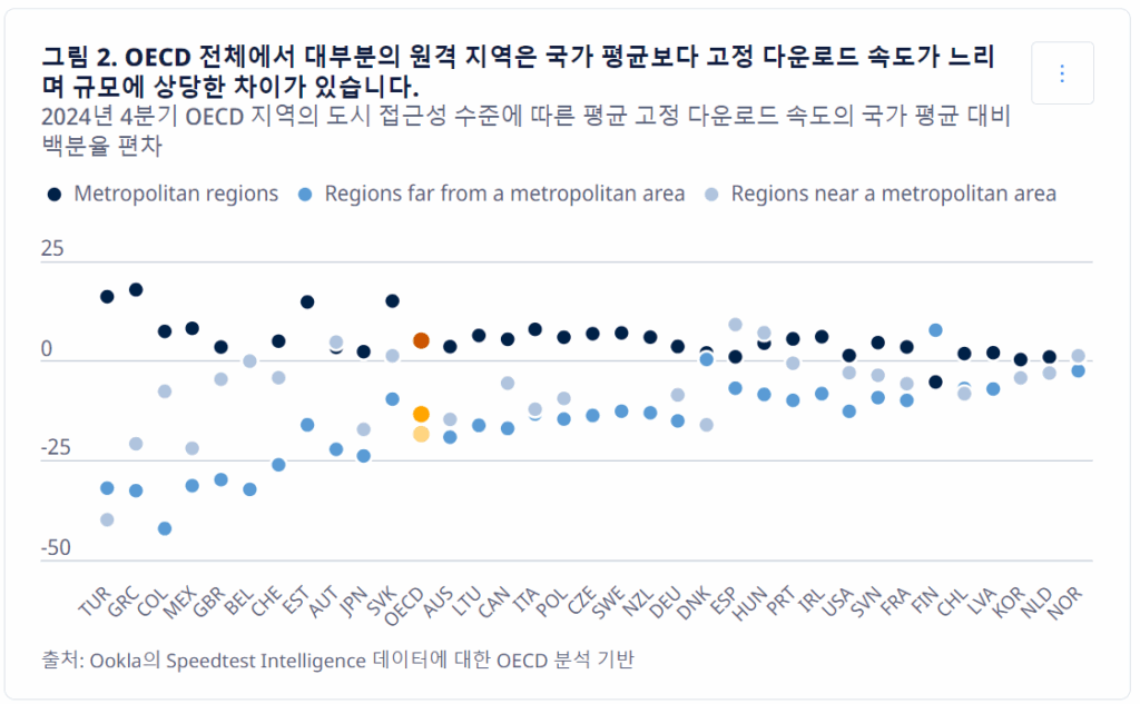 OECD 국가별로 도시와 농촌 지역 간 고정 광대역 다운로드 속도의 상대적 연결성 격차는 상당히 달랐다. OECD 국가 전체에서 농촌 지역의 평균 속도는 도시 지역보다 24%p 낮았다. 격차가 가장 큰 국가는 콜롬비아, 그리스, 터키였으며, 한국, 네덜란드, 노르웨이는 지역별 차이가 미미했다.