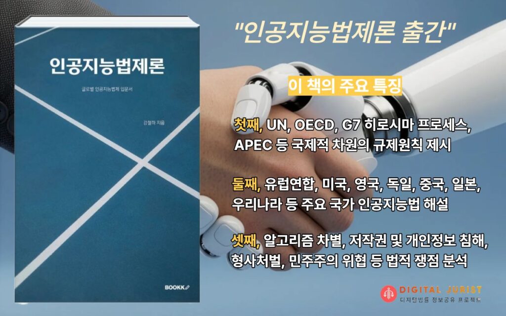 인공지능의 국가적, 산업적 중요성이 높아지는 가운데, 최근 기업, 정부, 대학(원)생 및 연구자들의 인공지능 연구와 정책 실무에 참고할 수 있는 서적인 ‘인공지능법제론’(저자 강철하, 2026.01.13)이 출간되었다.
