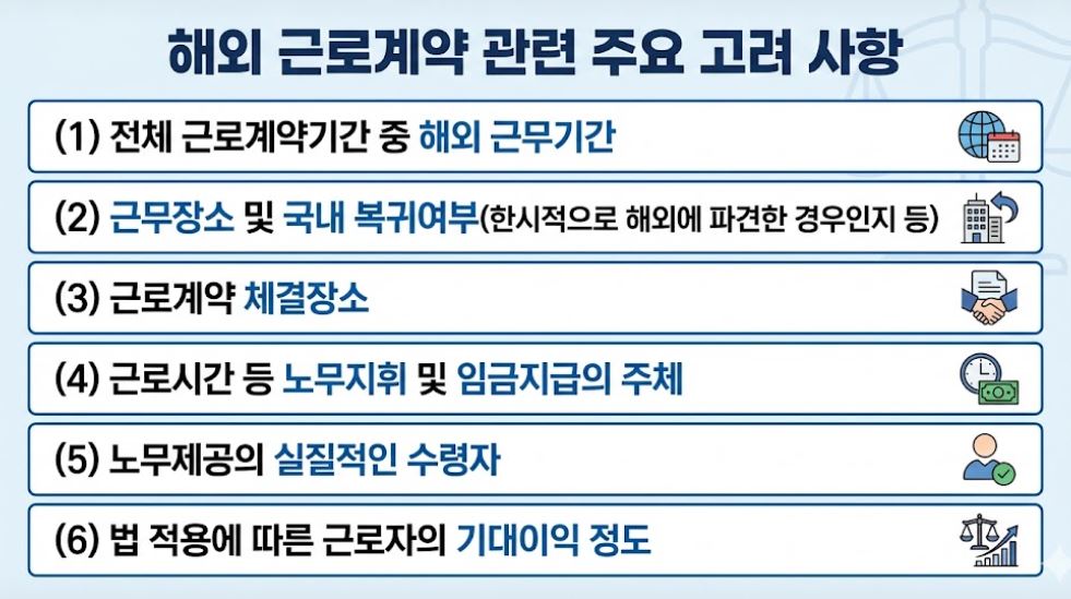 다만, 명시적 준거법 선택 여부와 준거법을 선택하지 않은 경우 등을 현실적으로 구별하기 어렵고, 판례에서도 사안마다 구체적 사정을 살펴 판단하고 있는 점을 고려하여, 묵시적 준거법 선택 여부 및 ‘일상적 노무제공 국가’에 대한 판단시 다음의 6가지 요소를 종합적으로 고려하여 근로기준법 적용 여부를 판단해야 한다.