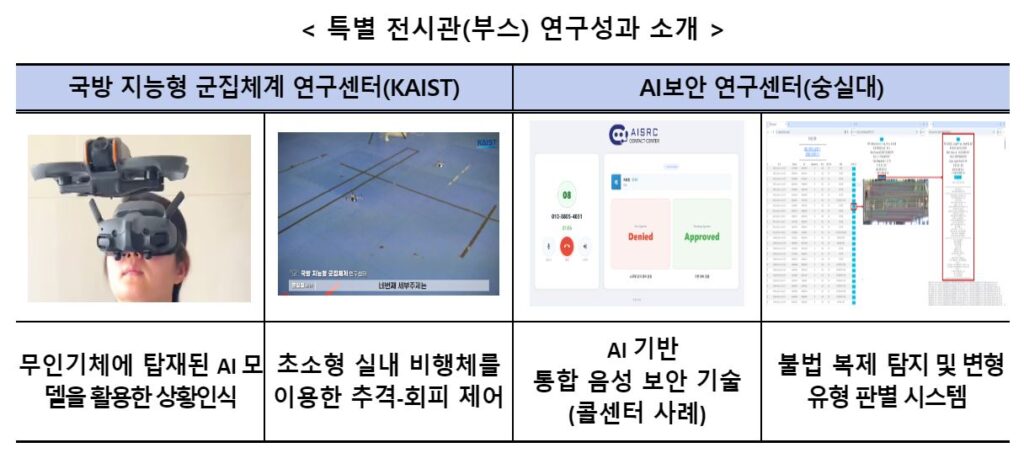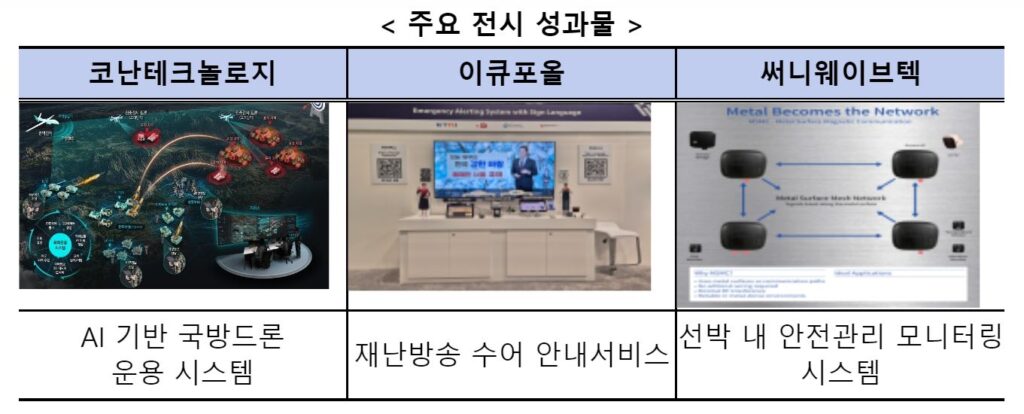 대표적으로 부총리 겸 과기정통부 장관 표창을 수상하는 ‘코난테크놀로지’는 표적을 실시간으로 탐지·식별하여 AI가 최적의 운용안을 제시하는 드론운용 시스템을, 부총리 겸 과기정통부 장관 상장을 수상하는 ‘이큐포올’은 AI를 활용하여 재난방송 콘텐츠를 수어로 변환하는 기술을, ‘써니웨이브텍’은 폐쇄적인 선박 환경에서도 안정적 통신과 실시간 모니터링을 지원하는 시스템을 전시한다.